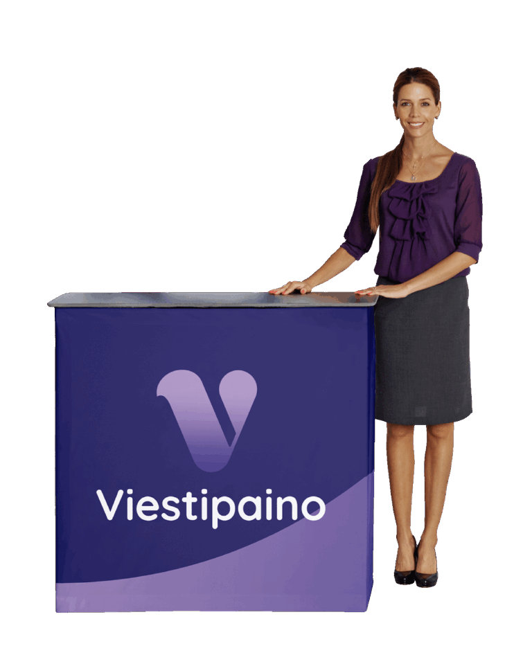 Matkalaukuksi muuntuva pöytä, jonka sisällä kuljetat koko messuosaston. Säilytystilaa n. 4-6 rollup-kasetille mallista riippuen.